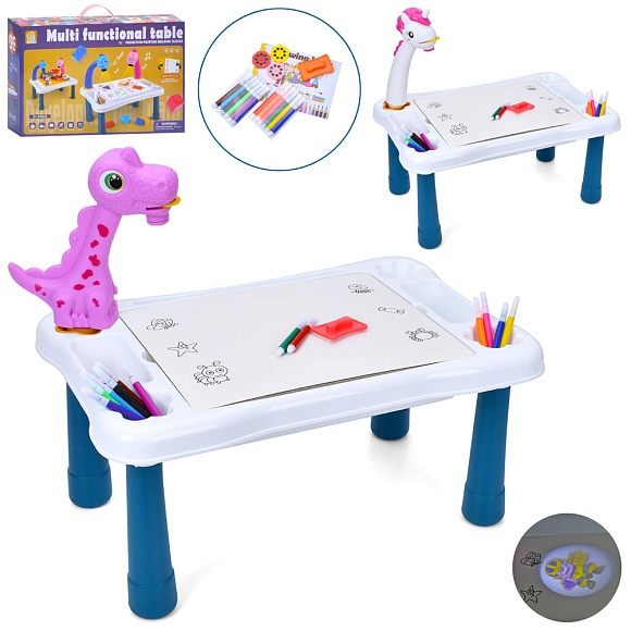 Опис Проектор rfy222-45-46 столик,3диска(24картинки)фломастери,2 види(динозавр,єдиноріг),муз.,світло.,бат