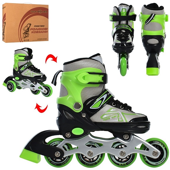 Опис Ролики A 4148-XS-GR (27-30) розсув.,шнур.+бакля,ал.рама,кол.ПУ64мм-1світ.,комбо,зелений,кор.,34,5-27