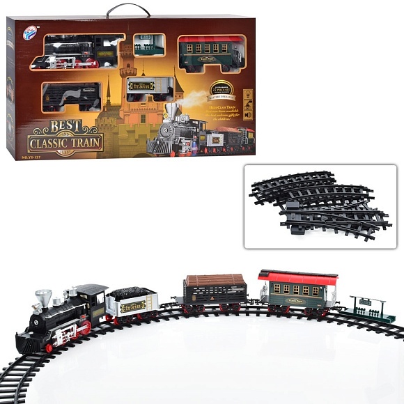 Залізниця YY-127EN довж.шляху650см.,локомотив,вагон3шт.,станція,дим,муз.,світло,бат.,кор.,80-44-12см
