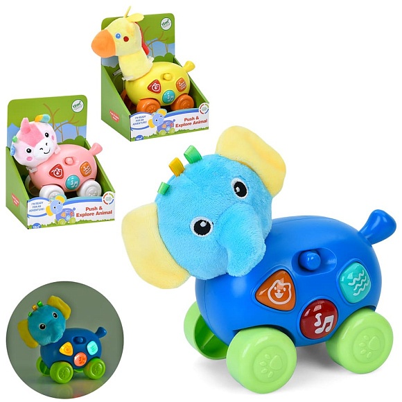 Музична іграшка 1953-1-2-6 тварина на колесах, голова плюш,3 види,муз.,світло,бат.,кор.,15-19-11,5см