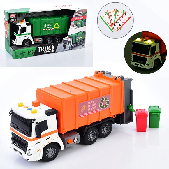 Опис Будтехнiка A1110-3-13 сміттєвоз, 1:16,інерц.,рух.деталі,2 кольори,муз.,світло,бат.,кор.,32,5-17-13см