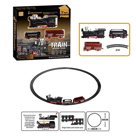 Опис Залізниця 9299-77 локомотив, 2 вагони, 13дет., муз., бат., кор., 27-25-5 см.