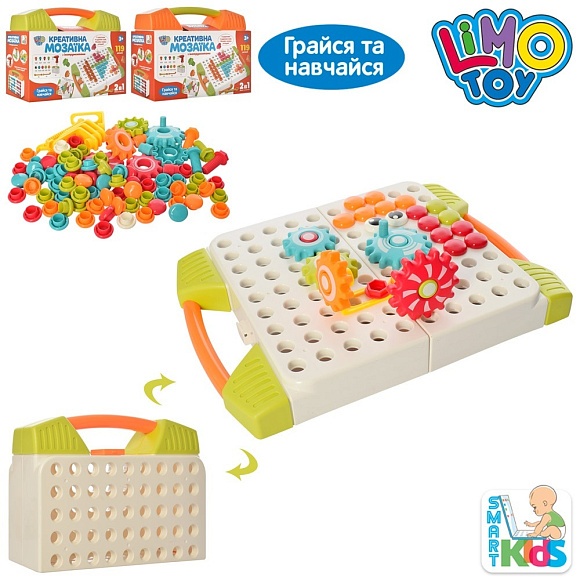 Опис Мозаїка M 5572 97дет., інструмент, 2кольори, шестерінки, валіза, карт.оберт., 27-20-10см.