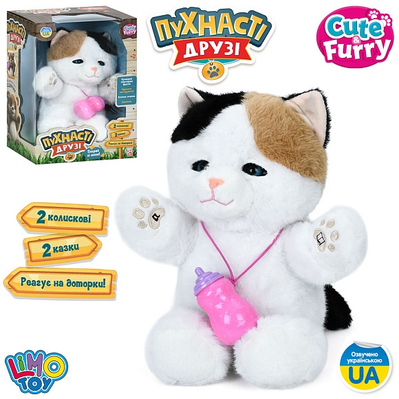 Опис Кіт M 6210 I UA сенсорний, м'яка іграшка, пляшечка, муз.(укр), бат., кор., 22-32,5-18 см.