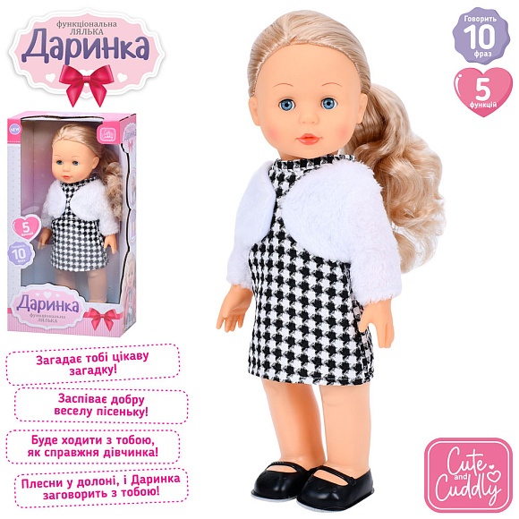 Опис Лялька M 5906 I UA Даринка, муз.(укр), реагує хлопок, ходит, пісня, бат., кор., 23,5-45-13 см.