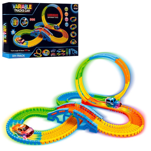 Опис Трек GD-8156A світиться в темряві, 305см., машинка-світло, їздить, 156дет., бат., кор.,49-32,5-7см.