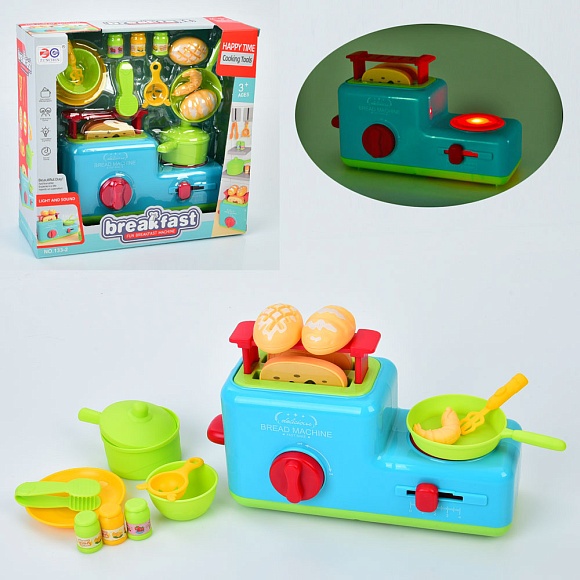 Опис Набір посуду 133-2 тостер+плита, кастрюля, продукти, муз., світло, бат., кор., 27-26,5-10 см.