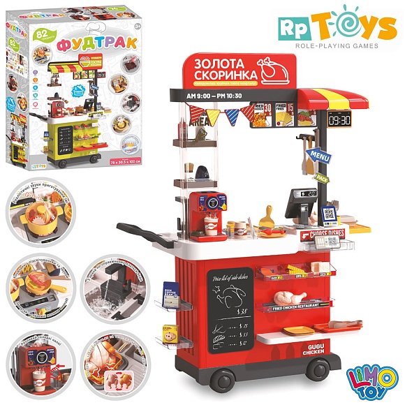 Опис Магазин 889-283 фаст-фуд,прилавок,плита,мийка-ллється вода,каса,продукти,76дет,.муз,світло,бат.,кор.