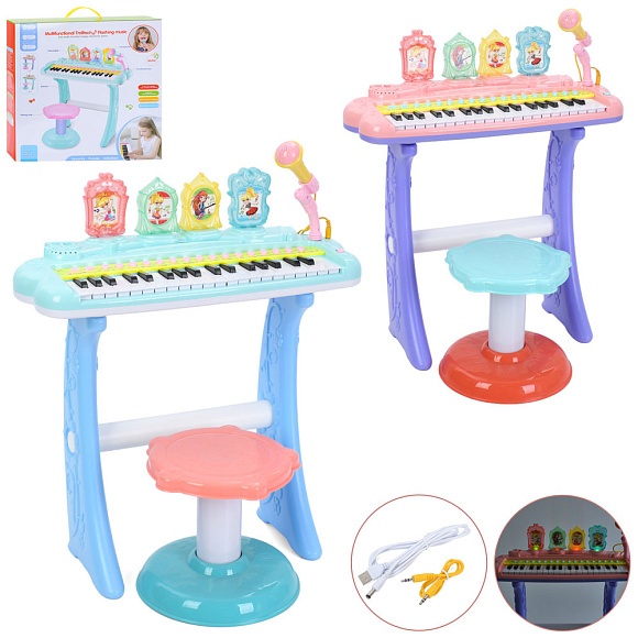 Опис Синтезатор r720 37клавіш, 47,5-21-в53см, стільчик, мікрофон,музика, mp3, 2 кольори, бат.,usb, кор.