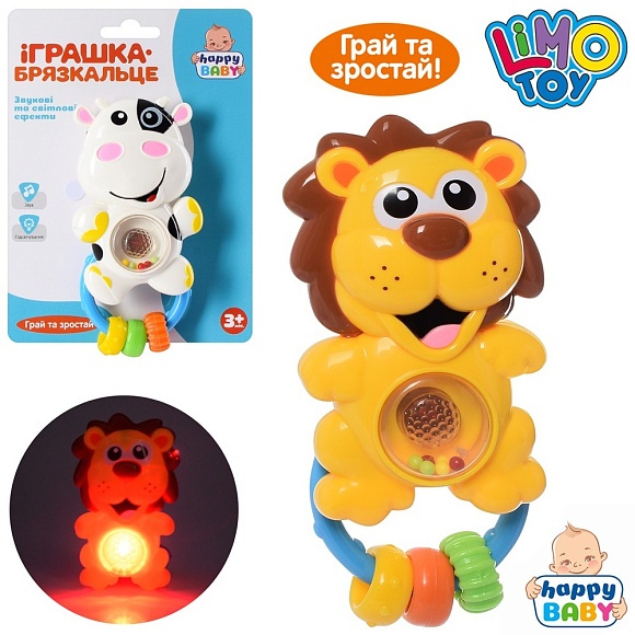 Опис Брязкальце hb 0018 cd 2види (лев,корова), муз., світло, бат.(табл.), лист, 15-20-3,5см.