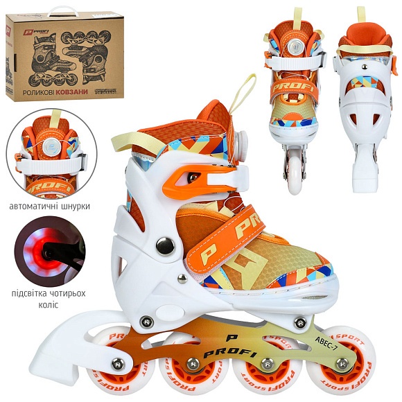 Опис Ролики A4156-S-OR (31-34) розсувні,шнурівка+бакля,алюм.рама,ABEC-7,колеса ПУ64мм,світло,біл.-помаран