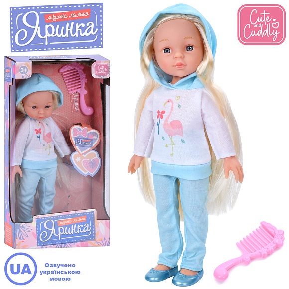 Опис Лялька M 5986 I UA Яринка, 2 пісні, гребінець, бат.(табл), муз. (укр), кор., 18-36-8 см.