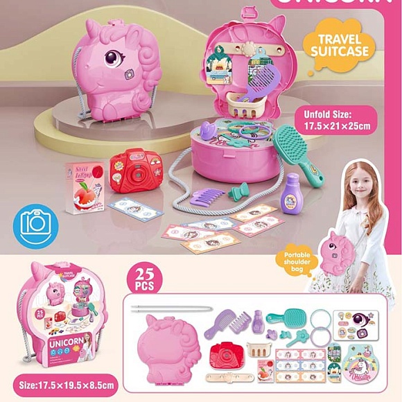 Набір ігровий KL02-2 аксес.для дівчат,набір перукаря,фотоапар.,25пред.,сумочка(єдиноріг),17-19-7,5см