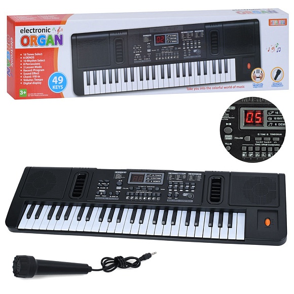Опис Синтезатор r753 (8шт) 49 клавіш,60-17-6см, мікрофон, ел.табло, 16тонів, 10ритмів, 6 демо, запис, регулятор гучності, на бат-ці, в кор-ці, 72-18,5-6,5см