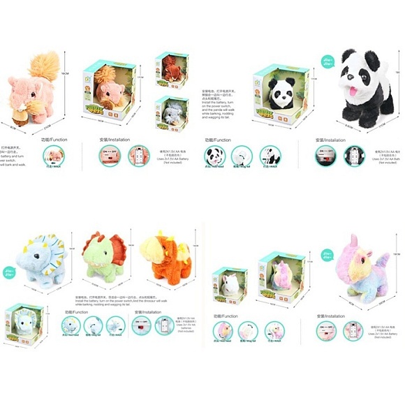 Опис Тварина 8A-1-2-3-4 ходить, плюш,9 видів(білка, динозавр, панда, єдиноріг),муз.,бат.,кор.,16-16-17см.