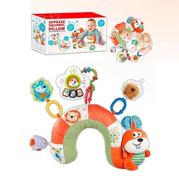 Опис Підвіска BY123 2в1(подушка),білка,підвіски 4шт.(брязк.,пискавка,піаніно),плюш,муз.,світло,бат.,кор.