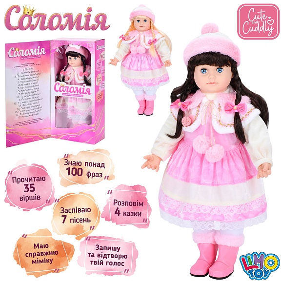 Опис Лялька m 5748 i ua Соломія,м'яконабивна,інтерактив.,міміка,2кольори,вірші,пісні,муз.(укр.),бат.,кор.