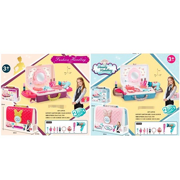 Опис Набір аксесуарів 16878A-B 2в1(трюмо,чемодан),набор перукаря,фен,гребенець,2кольори,карт.обг.,25-19-9