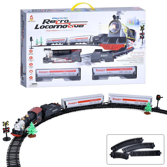 Опис Залізниця 22831 139-93см/93-93см, локомотив, 3 вагони, муз., світло, бат., кор., 56,5-32,5-6,5 см.