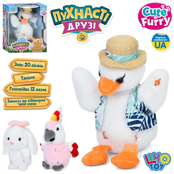 Опис Тварина m 6163 i ua 20 пісень,запис,12казок,рухл.,плюш,3види(папуга,гусак,зайчик),бат.,кор.,20-26-15