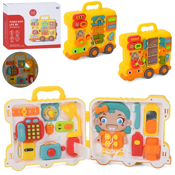 Гра YL625 бізіборд, автобус, фігурка, телефон,тостер,лампа,годинник,засуви,рух. деталі,мікс кольорів