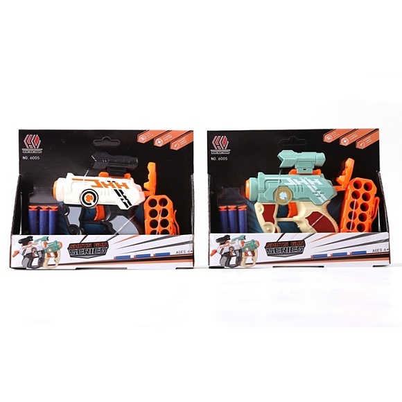 Опис Пістолет 6005a приціл, м'які кулі-присоски 3 шт., 2 кольори, кор., 25,5-20,5-4,5 см.