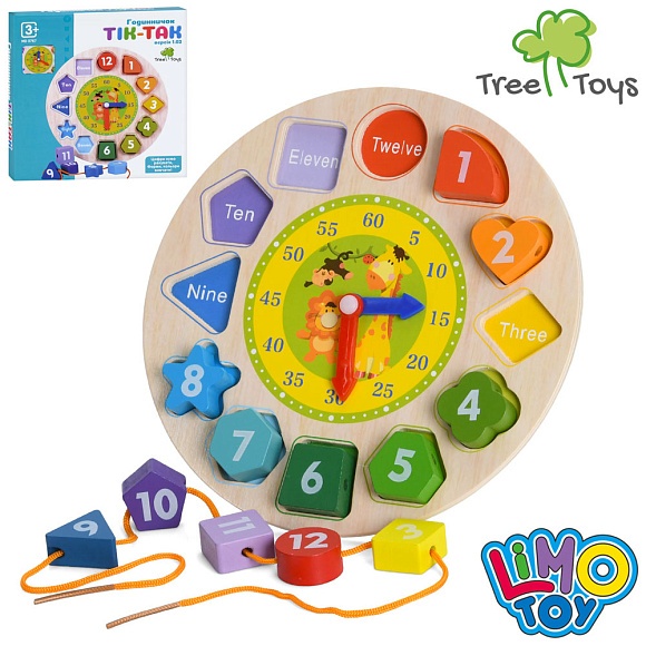 Опис Дерев'яна іграшка Годинник md 0767 (40шт) 21,5см, рамка-вкладиш, фігури-цифри, шнурівка, назви англ., в кор-ці, 22,5-22,5-2,5см