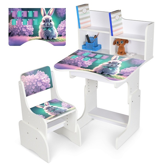 Парта N 2071-1-1 зі стільчиком, регул. висота, зайченя, таблиця множення, білий.