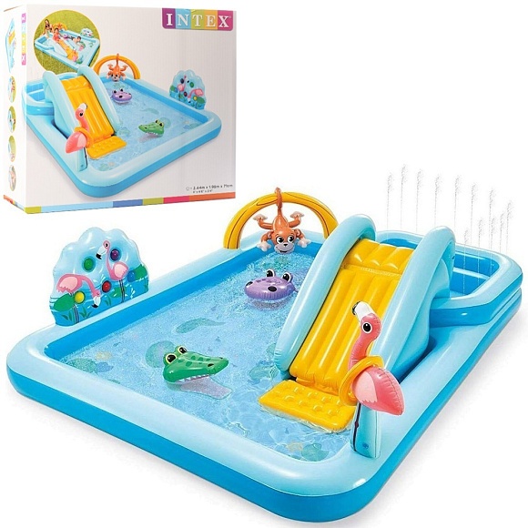 Опис Ігровий центр 57161 Джунглі,2басейна(493и57л),гірка,від 3 р.,злив.клапан,ремкомпл.,кор.,244-198-7см.