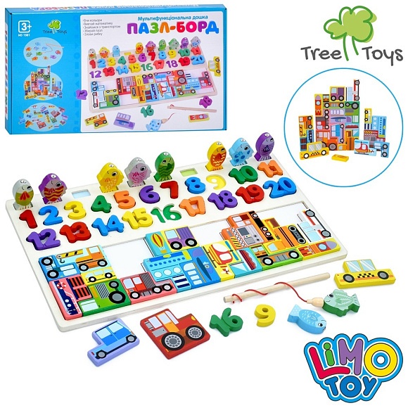 Опис Дерев'яна іграшка Багатофункціональна дошка md 1981 Пазл-борд,трансп.,ігр.поле,цифри,риболовля,кор.