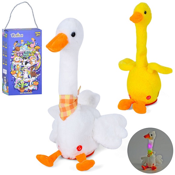Опис Тварина 777-105B-C гусак, повтор, танцює, 2 види, муз., світло, бат., кор., 18,5-37-12 см.