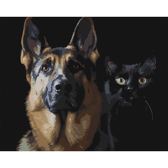 Опис Картина за номерами Strateg Німецька вівчарка та чорний кіт на чорному фоні 40Х50 (AH1297)