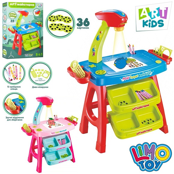 Опис Проектор AK 0003 AB для малюв.,столик,крейда воск.,слайди,2кольори,світло,бат.,кор.,69-43-10см.