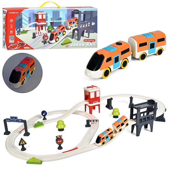Опис Трек 7731a поїзд, 1 вагон, дорожні знаки, 35дет., світло, бат., кор., 48-21-9,5 см.