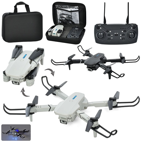 Опис Квадрокоптер E88 радіокер., USB, камера, запасні лопасти, акум., 2 кольори, світло,валіза,22-16-7см.