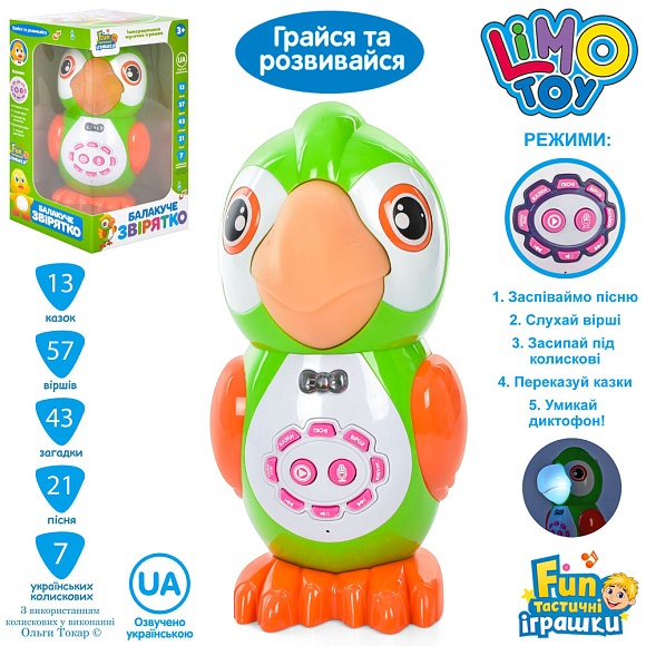 Опис Інтерактивна іграшка ft 0041 Аудіо-казки, папуга, сенс.,навч.,муз.(укр.),світло,бат.,кор.,16-27-15см