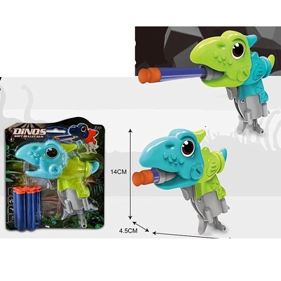 Опис Автомат 318 динозавр, м'які кулі-присоски 4 шт., 2 кольори, кул., 19-16-5 см.