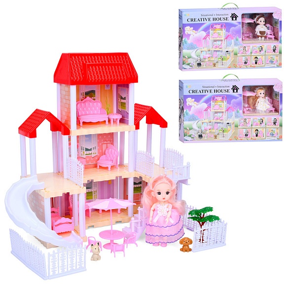 Будиночок 666-8V-3-9-11 3 поверхи,гірка,меблі,лялька(шарнірна),тварини,3види,світло,бат.(табл.),кор.