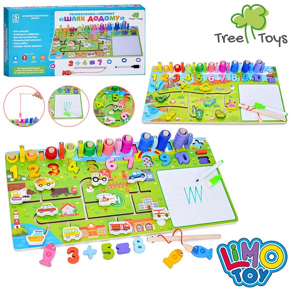 Дерев'яна іграшка Багатофункціональна дошка MD 0825 лабиринт,рибалка,дошка для малюв.,кільця,маркер
