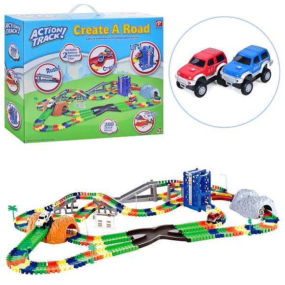 Опис Трек CF1108 288 предметів, машинки 2шт., мости, дерева,знаки, бат., кор., 40-50-12 см.