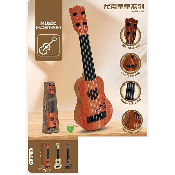 Опис Гітара 601a-2-601b-2 42см, 4 струни, медіатор, 2 види по 3 кольори, кор., 16,5-43,5-5,5см