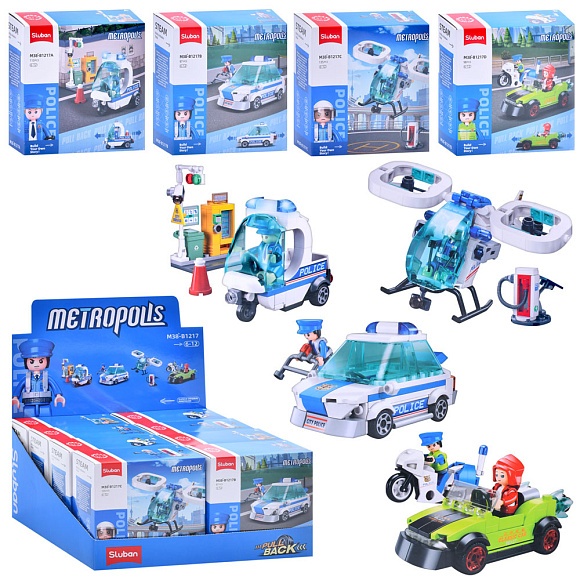 Опис Конструктор SLUBAN M38-B1217 поліція,транспорт,від 97дет,4 види, 8шт. в диспл., кор.,30-15,5-25,5см.