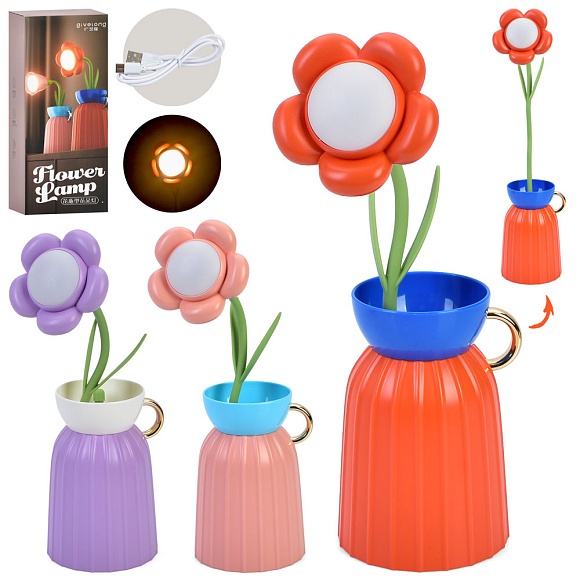 Опис Нічник gl371 квітка у вазі, акум., гнучке стебло, usb, 3 кольори, світло-3 режими, кор.,9,5-23-9,5см