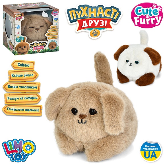 Опис Собака m 6240 i ua сенсор.,муз.(укр),пісня,звук,клипає очима,виляє хвост.,плюш,2 кольори,20см,на бат