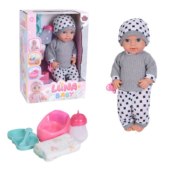 Лялька AKG-0061 пупс, п'є-пісяє, горщик, пляшечка, соска, підгузок, посуд, бат., кор.,26,5-38-15,5см