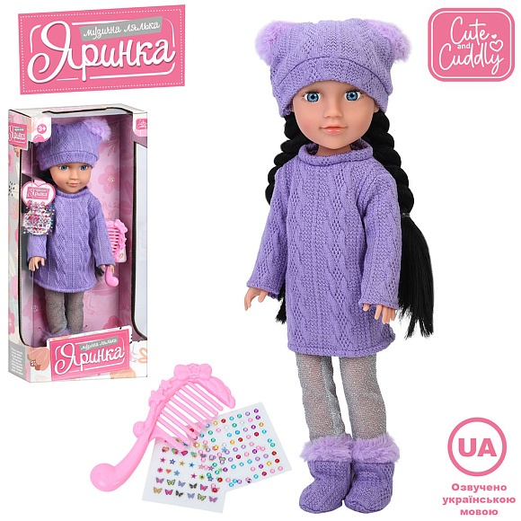 Опис Лялька m 6232 i ua Яринка, муз.(укр), пісні, гребінець, стрази-наліпки, бат.(табл),кор.,20-43-9,5см.
