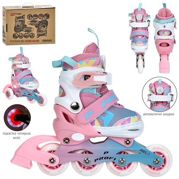 Ролики A 4148-XS-PBL (27-30) розсув.,шнур.+бакля,ал.рама,колПУ,64мм,1світ.,комбо,рожев.,кор.,34,5-27