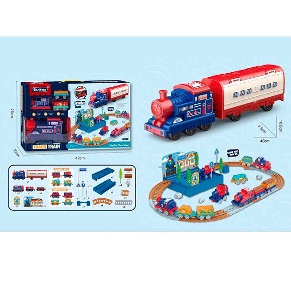 Опис Залізниця 128-47 3 локомотива (1шт.-інерц., 1шт.-їздить), вагони 4шт., дерева, бат., кор.,42-25-10см