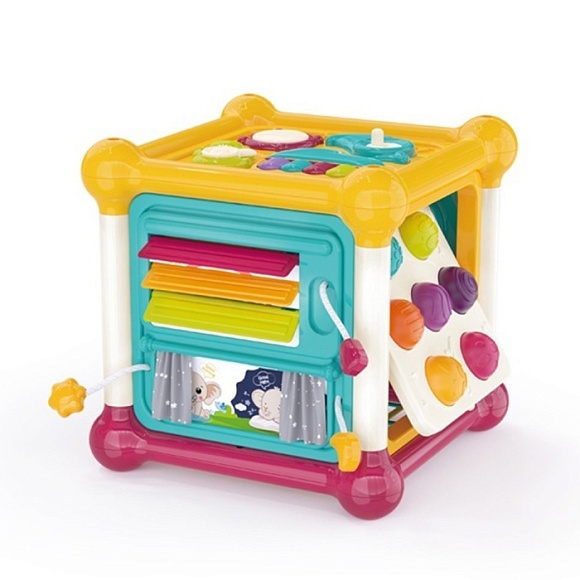 Опис Гра 3860 куб, рухливі деталі, фігури-брязкальця, м'які кнопки/pop it, муз., бат., кор., 18-18-18 см.