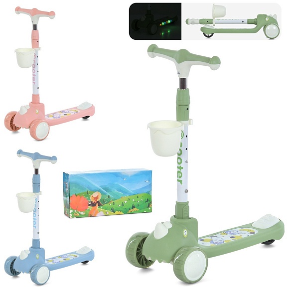 Самокат JR 3-107 Mini,мет.+пласт.,2пер.ПУ110мм,задн.80мм,кермо4полож.,3кольори,муз.,світло,бат.,кор.